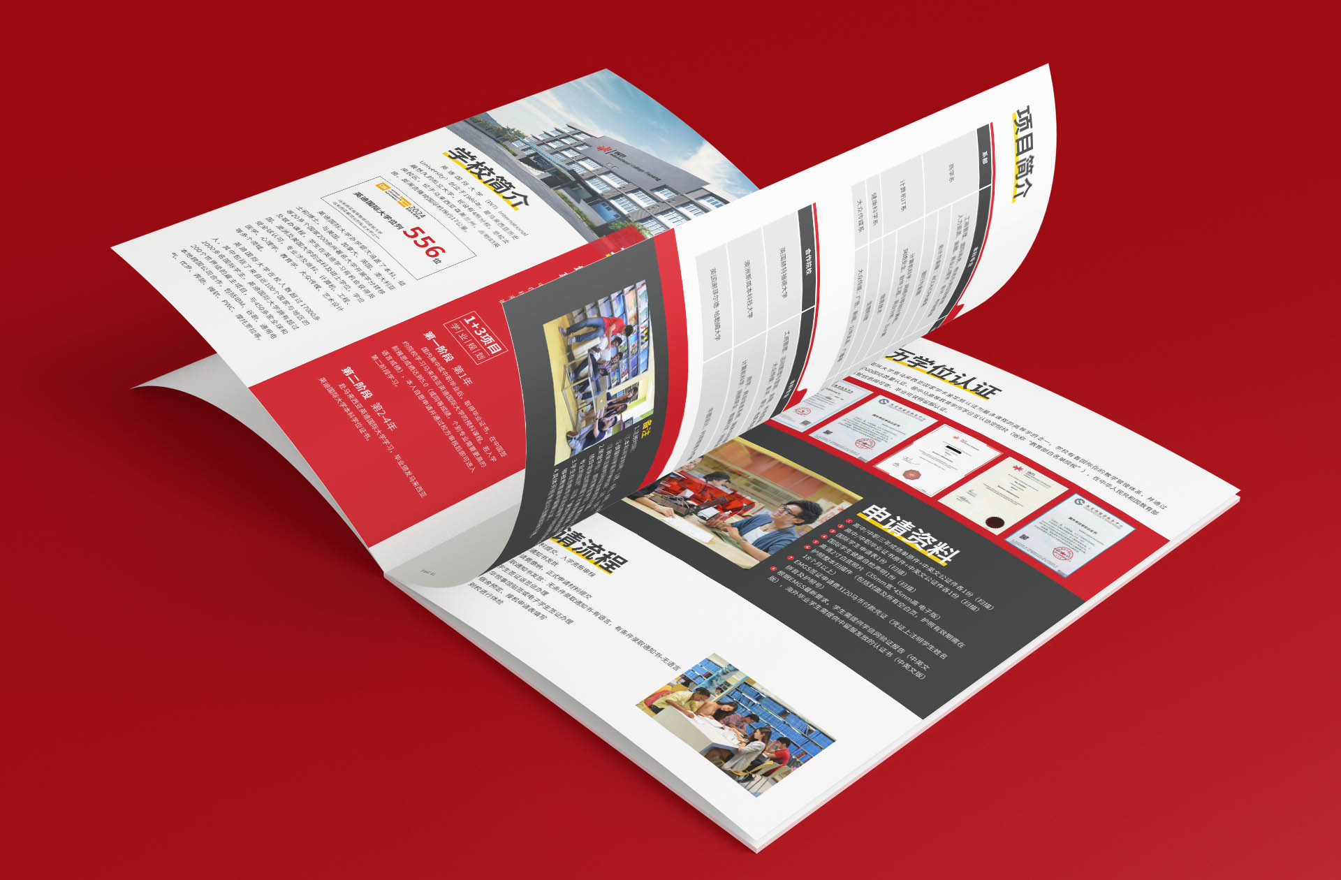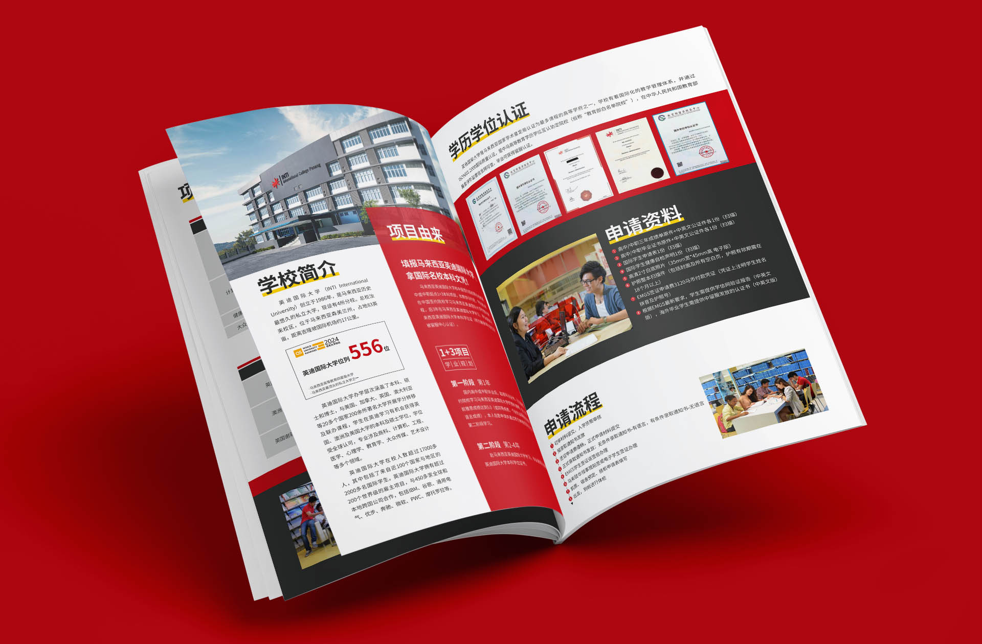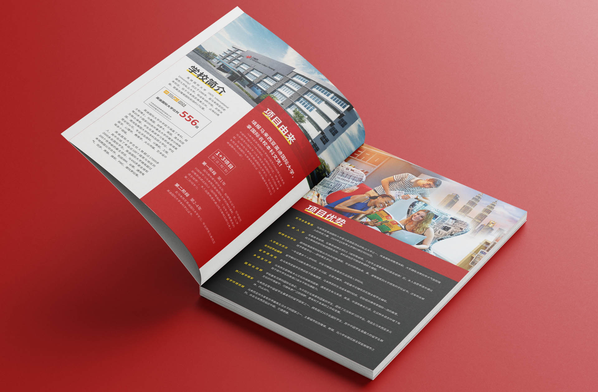 今天给大家分享,马来西亚英迪国际大学1+3本科招生简章设计,该项目采用1+3学制。全本册子以红色为主色,传概留学热概念,突出年轻人奋头,拼博的特点,采用商务风格进行设计,设计象征图形及图标,提升视觉展示效果,为营销赋能。关注我,每天分享宣传册设计案例。